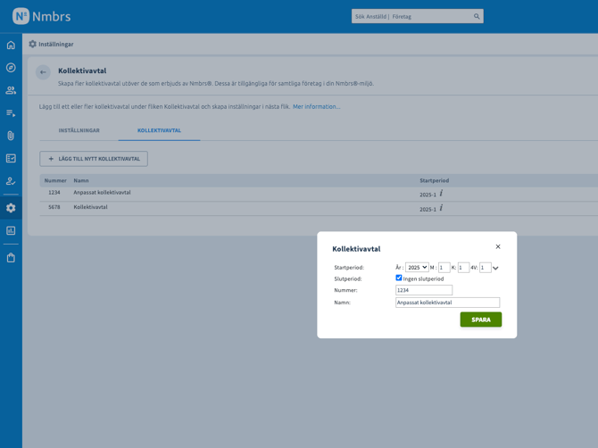 I denna modul kan du välja mellan två flikar, välj Kollektivavtal och sedan + LÄGG TILL NYTT KOLLEKTIVAVTAL. Här fyller du i startperiod, om det finns en slutperiod, nummer och namn på ditt kollektivavtal och trycker på "SPARA".