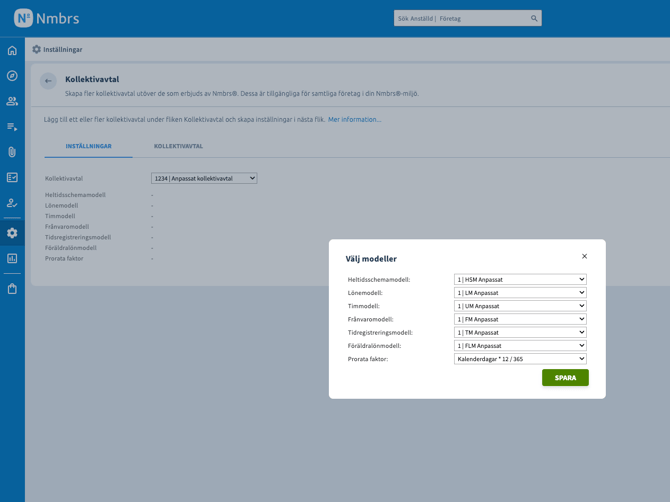 När du har skapat ditt kollektivavtal går du till fliken Inställningar, väljer ditt skapade kollektivavtal i drop down-menyn och klickar sedan på bindestrecken för att få upp rutan som visas på bilden. Här väljer du vilka modeller som ska ingå, föräldralönemodellen är valfri.