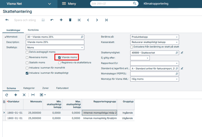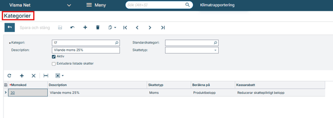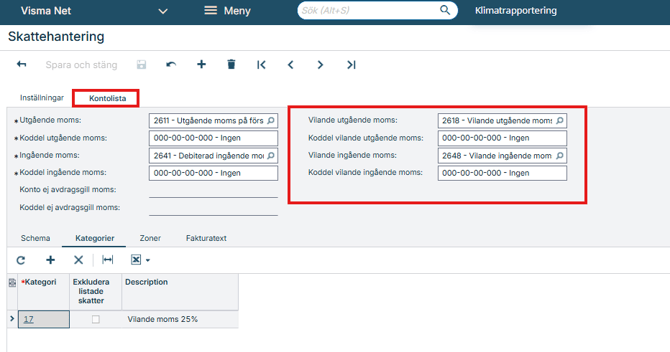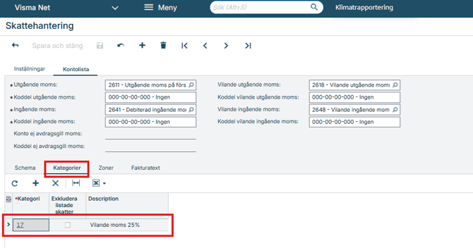 Skapa även en ny skattekategori för hantering av vilande moms och koppla denna kategori till den nya momskoden.