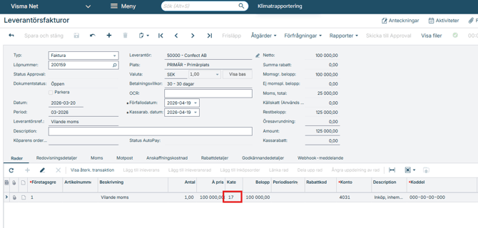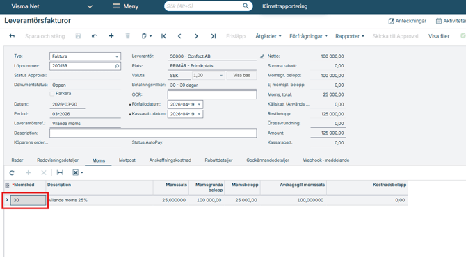 Vid registrering av en faktura med vilande moms ska den nya skattekategorin och momskoden väljas.