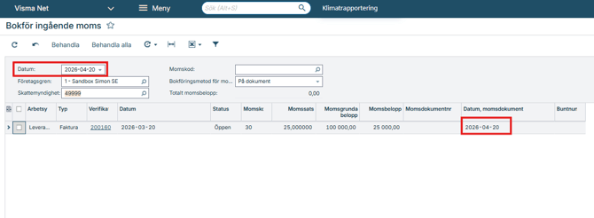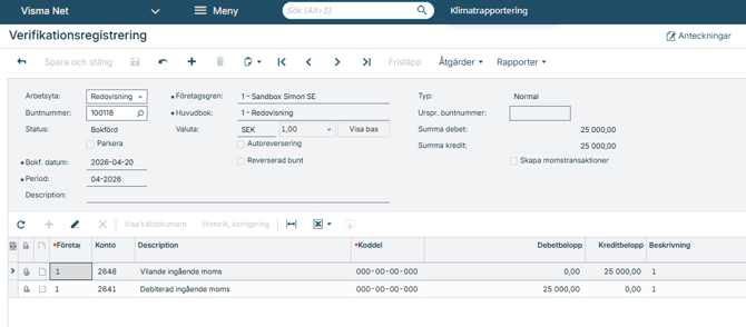 Det skapas ett verifikat som omför momsen.