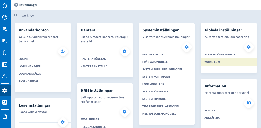 För att ställa in ett workflow för ditt företag, gå till fliken Inställningar → Globala inställningar → Workflow.