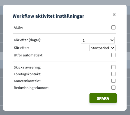 3. Välj vilken åtgärd den valda aktiviteten ska följa. Detta kan vara början av perioden eller efter körningsförfrågan.