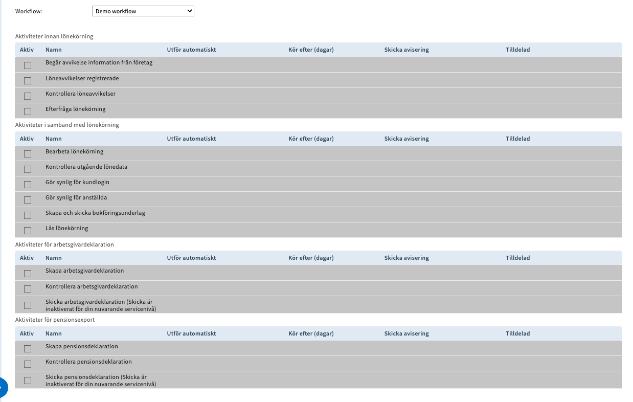 När du har skapat ditt workflow, gå in på fliken Inställningar och välj ditt workflow i rullgardinsmenyn. Detta är alla möjliga aktiviteter i ett löneworkflow. Alla aktiviteter är inaktiva som standard.