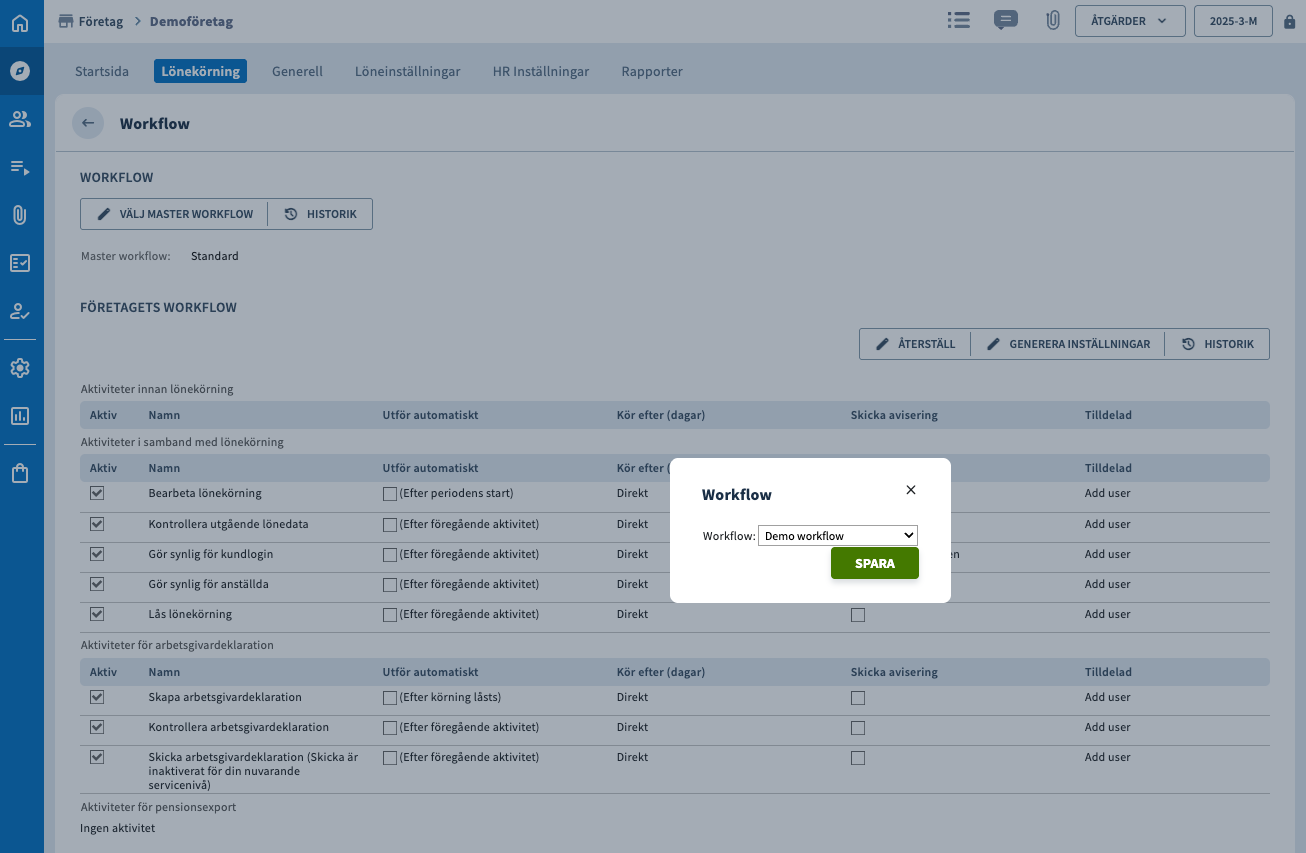 När du konfigurerat ditt anpassade workflow går du till Utforskaren → Företag → Lönekörning → Workflow. Klicka sedan på "VÄLJ MASTER WORKFLOW" och välj ditt nyskapade workflow i rullgardinsmenyn.
