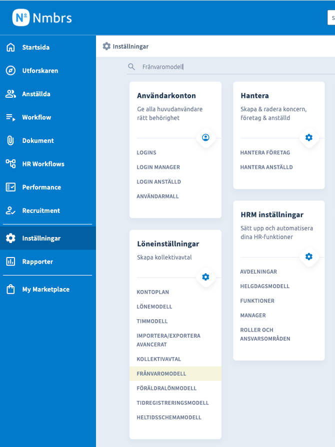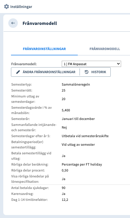 Frånvaromodellen finner du under fliken Inställningar → Löneinställningar → Frånvaromodell.