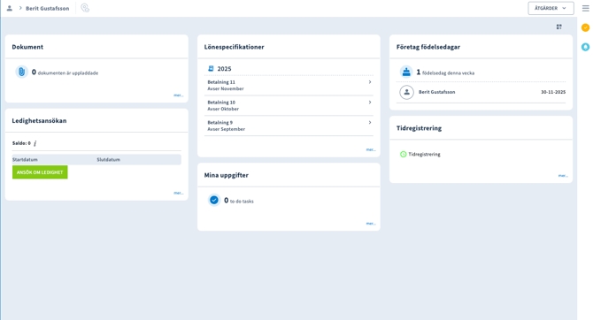 Startsidan när en medarbetare med anställd login loggar in ser ut som nedan. Den är fylld av moduler som går att aktivera, ta bort och flytta runt som önskas.