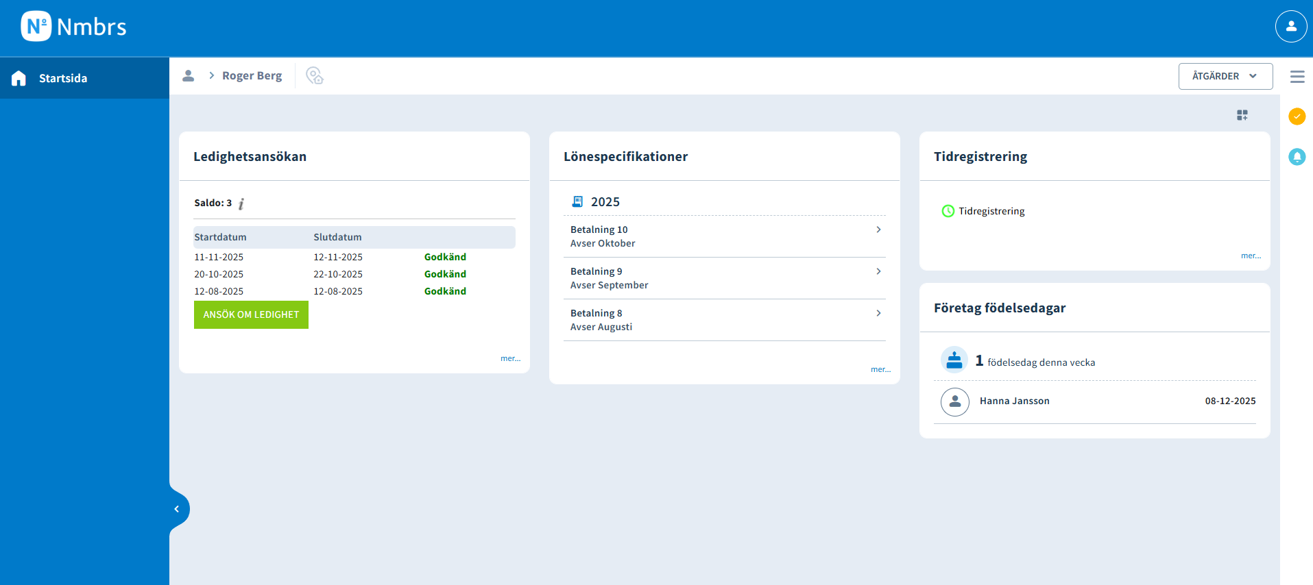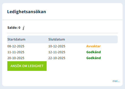 När du loggar in finner du modulen Ledighetsansökan på startsidan. I modulen ser du ditt semestersaldo samt ledighet du ansökt om och status på ansökan. Klicka på "Ansök om ledighet".