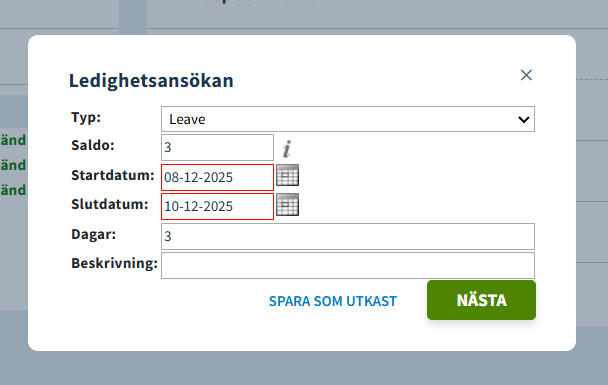 Fyll sedan i start- och slutdatum och eventuell beskrivning. Därefter kan du välja att spara ansökan som utkast eller klicka på "Nästa". På nästa ruta väljer du "Skicka".
