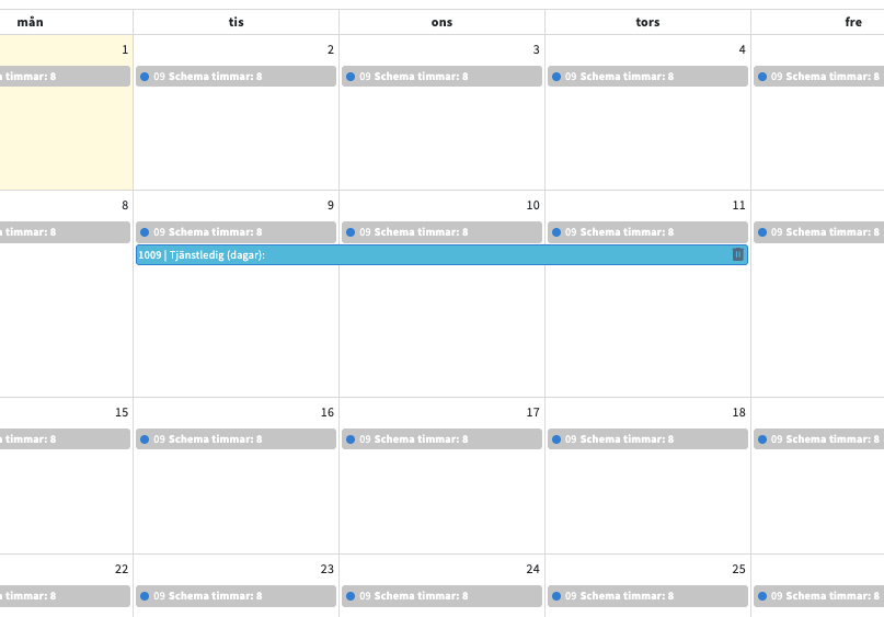 I månadsvyn kan du registrera hela dagar och i vecko- och dagsvyn kan du registrera timmar. Klicka och dra musen över de dagar eller timmar du vill registrera tid eller frånvaro för.