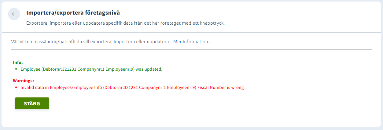 - Info: Här ser du vilken data som har importerats korrekt.