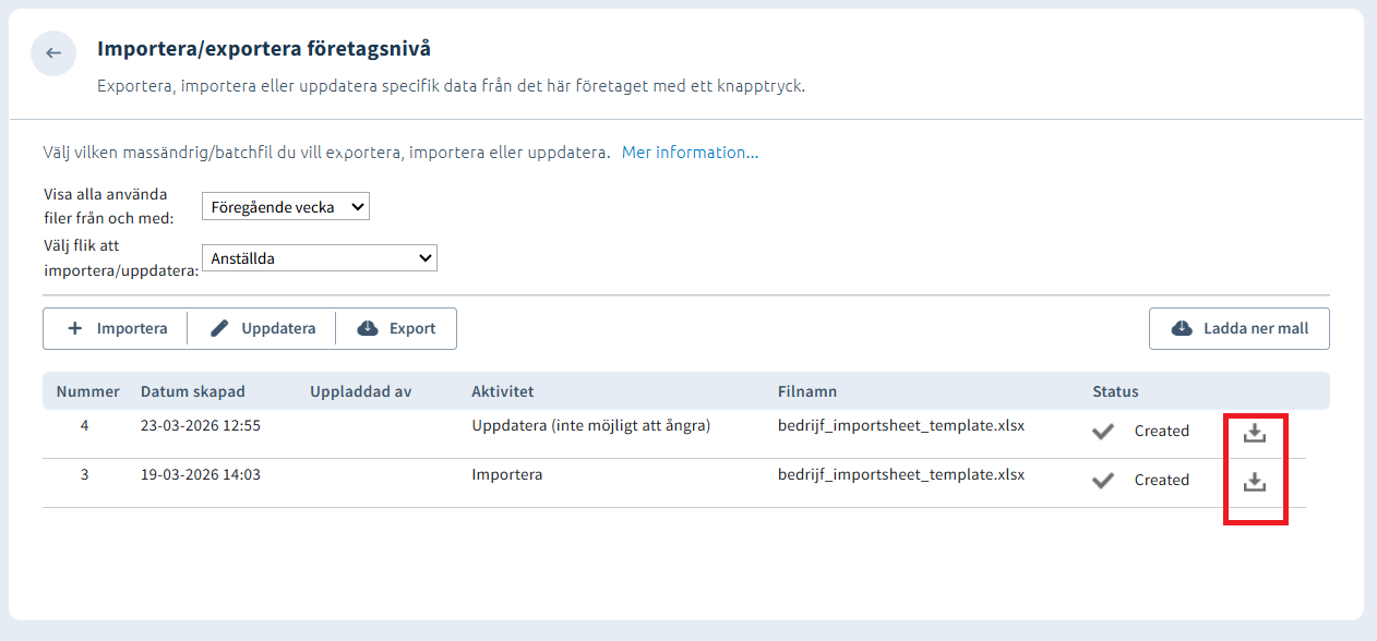 - Uppdatera/ersätt befintlig information med hjälp av importmallen. Fyll endast i den information som ska uppdateras samt korrekt koncernnummer, företagsnummer och anställningsnummer så att systemet vet vem eller vilka uppdateringen ska appliceras på.