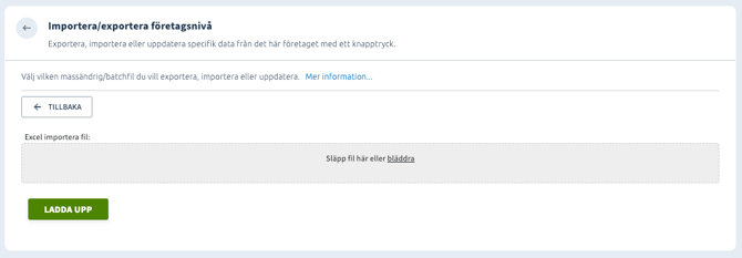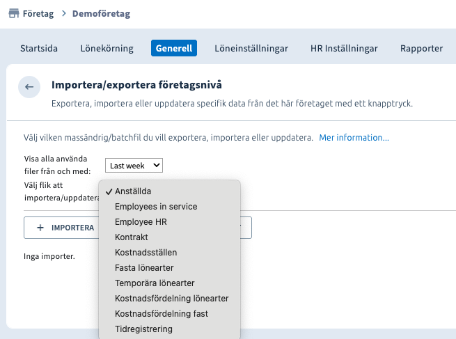 För att komma till modulen gå till ditt valda företag → Generell → Importera/exportera företagsnivå.