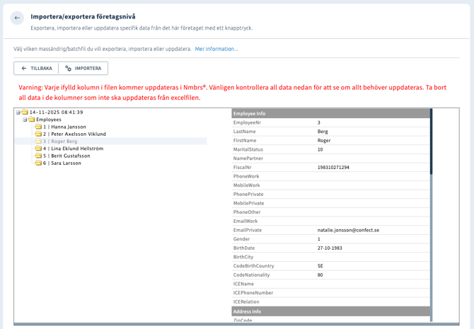 - Vid alternativ "Uppdatera" kommer all data i Excel-filen att uppdateras för medarbetaren, behåll endast den data som du vill ska uppdateras.