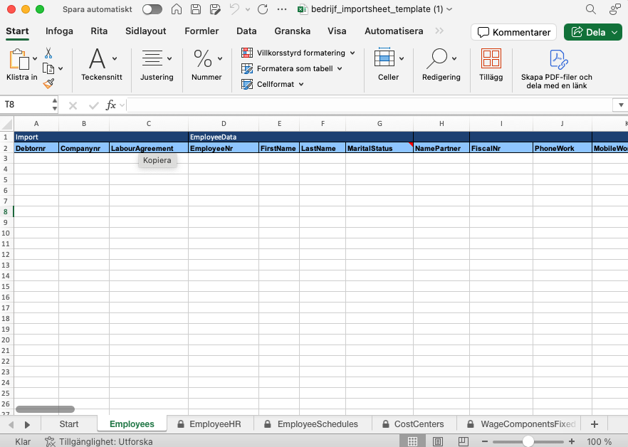 Mallen är en Excel-fil, i denna fil har fliken "Anställda" valts, därför är det ett lås på de andra flikarna. Fyll i den information som ska importeras