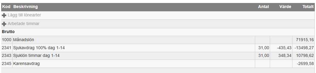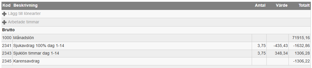 Detta är samma person som i exemplet ovanför men karensavdraget är ungefär hälften så stort då personen endast var frånvarande i 3,75 timmar.