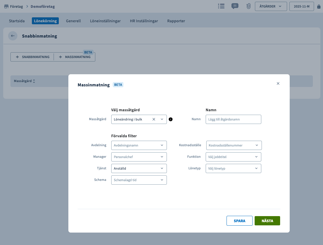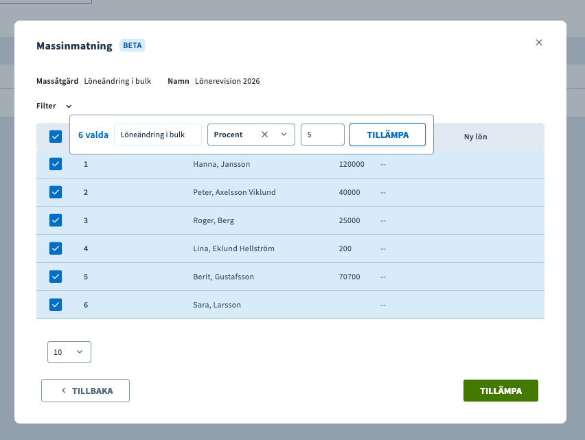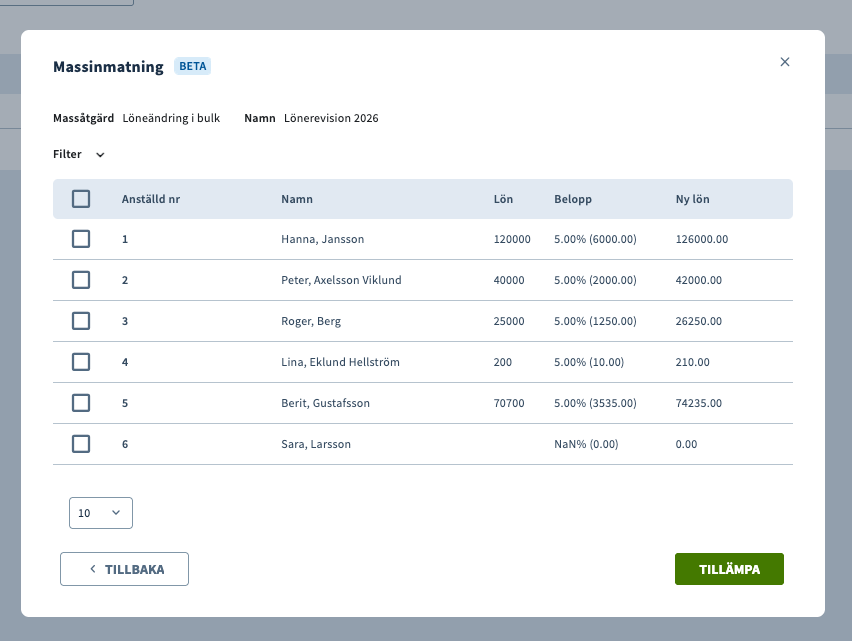 Med denna funktion kan du göra en massändring av löner för flera anställda samtidigt, det sparar tid genom att förhindra repetitivt arbete och minskar fel då de nya lönerna syns omedelbart innan ändringarna sparas.