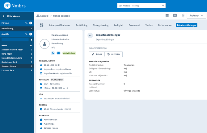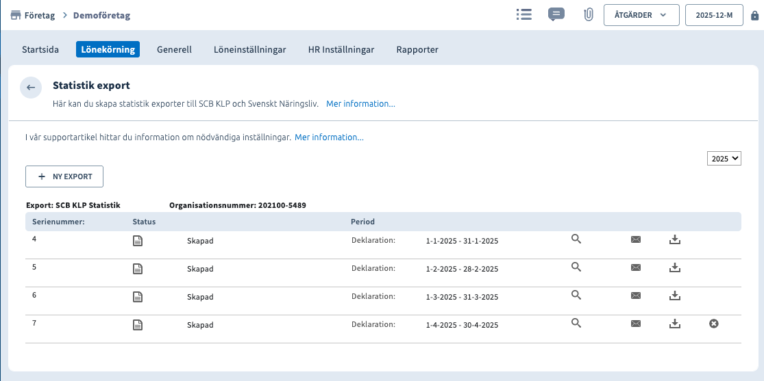 För att skapa en exportfil gå till företaget och du finner modulen Statistik export under fliken Lönekörning om den är aktiverad där, om inte, aktivera den eller sök på Statistik export i hamburgaremenyn till höger.