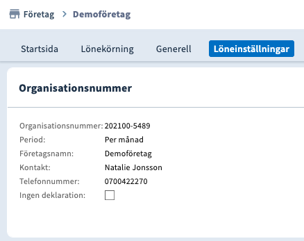 På företagsnivå är det endast organisationsnummer och företagets namn som är obligatoriska uppgifter för rapporten. Fyll i modulen Organisationsnummer som du finner genom att gå till Utforskaren → Företag → Löneinställningar.