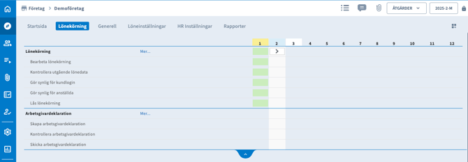 Översikten för lönekörningen hittar du genom fliken Utforskaren → Företag → Lönekörning. Siffrorna står för perioderna, det här företaget är i period två, som man också kan se högst upp i höger hörn. Klicka på pilen under siffran för att starta lönekörningen.