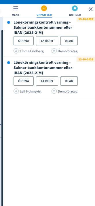 Avvikelserna som behöver hanteras hamnar i en uppgiftslista som du finner högst upp till höger under Uppgifter. Klicka på hamburgaremenyn bredvid låset för att öppna upp denna sidoflik.