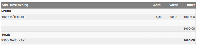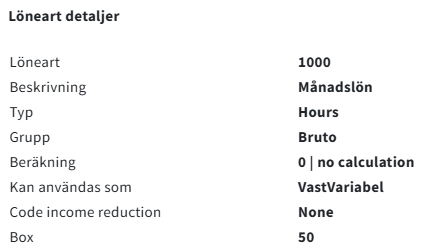 När man sedan tittar på lönespecifikationen ser man att registreringen fallit ut i lönearten som visades högst upp i artikeln. Timkoderna är däremot "osynliga", de syns inte på samma sätt i systemet om man inte lägger till dem direkt i den interaktiva lönespecifikationen eller i modulen Extra timmar/dagar. I just denna timkod är värdet redan beräknat eftersom den utgår ifrån medarbetarens timlön. I andra timkoder kan man dock ändra beräkningen, det är därför viktigt att hålla koll på vilka koder som är kopplade till varandra. Här finner du en lista över kopplingarna av de vanligaste koderna och arterna.
