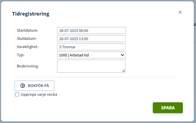 I detta exempel kommer vi att registrera arbetad tid åt en medarbetare. Vi går till veckovyn i tidregistreringen för vald medarbetare och väljer timmar samt tidregistreringskod.