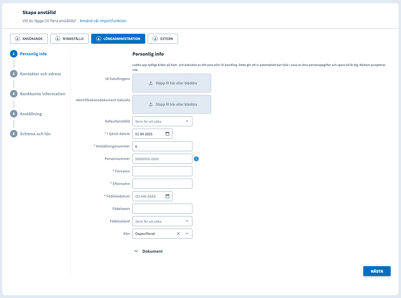 Därefter kommer du till denna sida och här behöver du minst fylla i de fälten med en röd "*". När du är nöjd, klicka på "NÄSTA" och fortsätt följa alla steg tills din nya medarbetare är färdig.