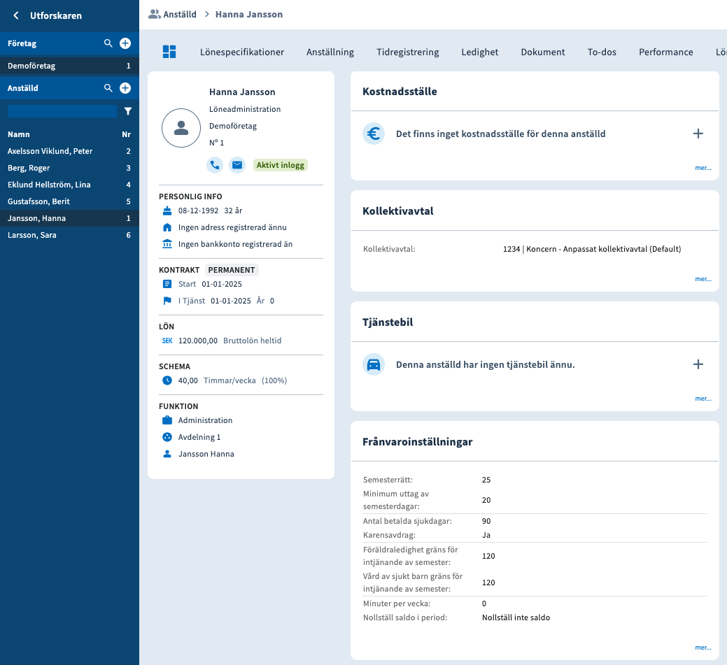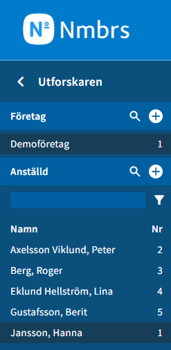 När du klickar på fliken Utforskaren i vänsterpanelen och väljer ett företag kommer det se ut på detta vis. Därefter klickar du på +-tecknet på "Anställd"-raden.