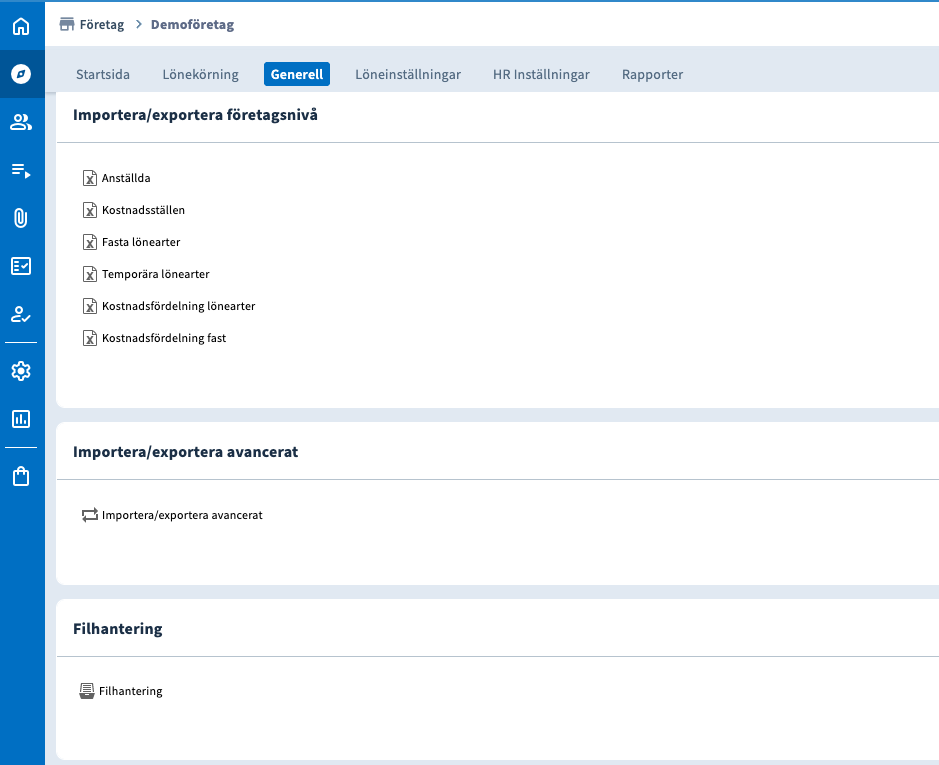 Genom att klicka på "GENERERA FILER" kan du ta ut rapporter av de olika dokumenten. När du har genererat en fil finner du den via Utforskaren → Företag → Generell och sedan skrolla ner till Filhantering.