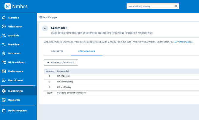 Under fliken Lönemodeller kan du skapa en ny lönemodell, se översikten över alla dina modeller eller radera lönemodeller.