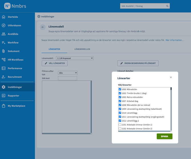 När du går in på fliken Lönearter väljer du den modell du vill redigera i rullgardinsmenyn och klickar sedan på "VÄLJ LÖNEARTER" och väljer de lönearter företaget kommer att använda. Det finns många lönearter i Nmbrs, för att lättare hitta dem lönearter som är relevanta för företaget kan man söka på till exempel "Kostförmån" genom att trycka på Ctrl+F.