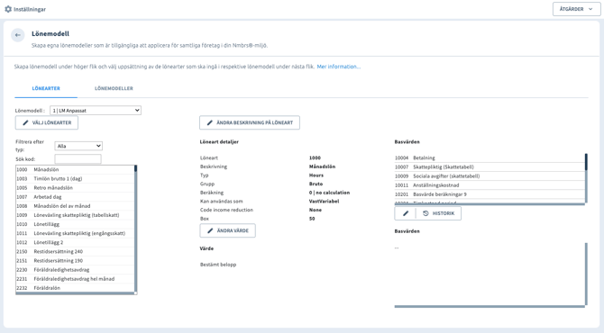 Lönearterna är dem som visas på lönespecifikationen och redovisar utfallet av timkoderna. Lönearter går även att läggas till direkt, antingen i den interaktiva lönespecifikationen eller i modulen Lönearter på anställdnivå. Om du klickar på en löneart kan du se information kring den, som om det är en brutto- eller nettolöneart och om den kan registreras som en fast eller temporär löneart.