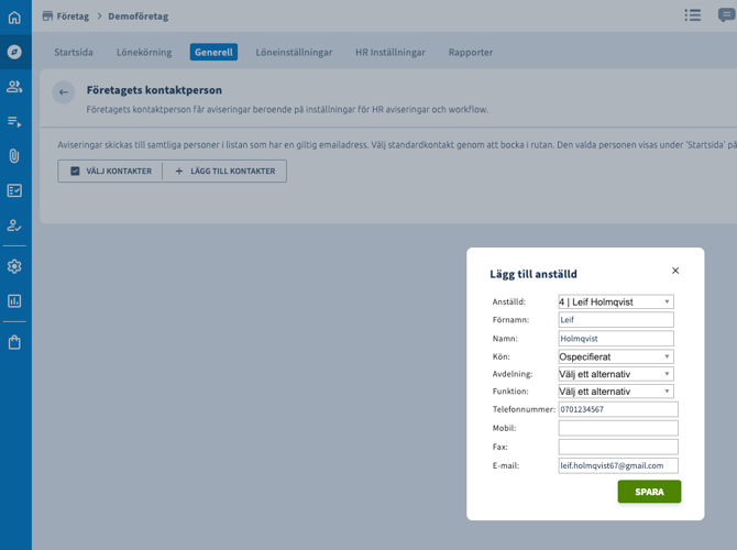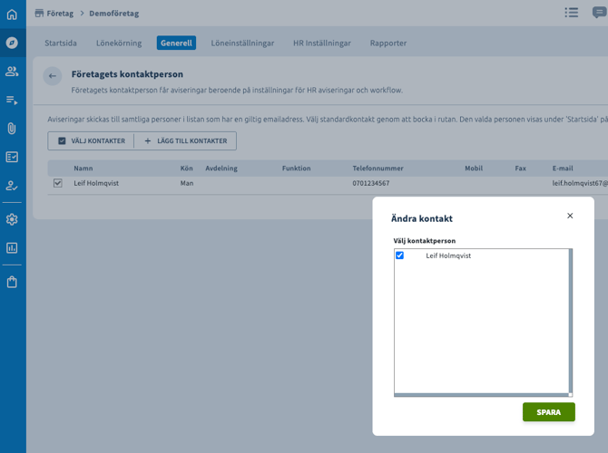 Kontaktpersoner är nödvändiga när du ska skapa arbetsgivardeklarationer, de kommer också att få signaler beroende på inställningarna i företagets löneworkflow. Det är därför viktigt att inmatningen för dessa kontaktpersoner skrivs in korrekt och att rätt e-postadress anges.
