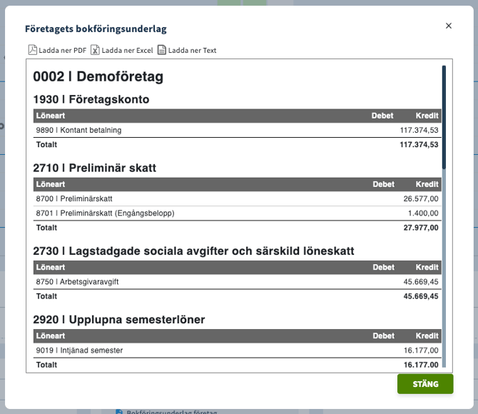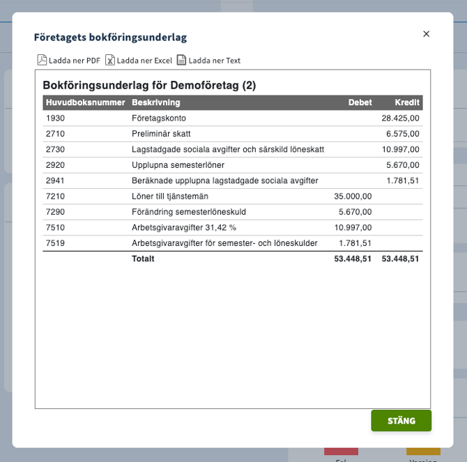 Klicka på det bokföringsunderlag du vill öppna. Du kan ladda ner underlaget som PDF-, Excel- eller Textfil.