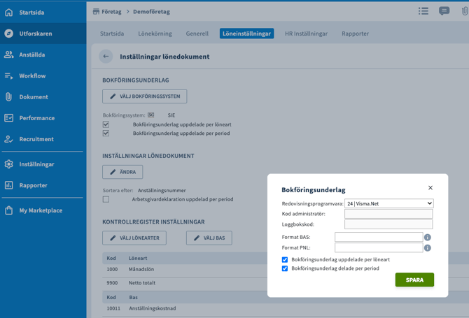 Det är även möjligt att ändra hur bokföringsunderlagen visas upp. Bokföringsunderlagen kan delas upp per period och per löneart. Denna inställning finner du under UtforskarenFöretagLöneinställningarInställningar lönedokument → "VÄLJ BOKFÖRINGSSYSTEM"