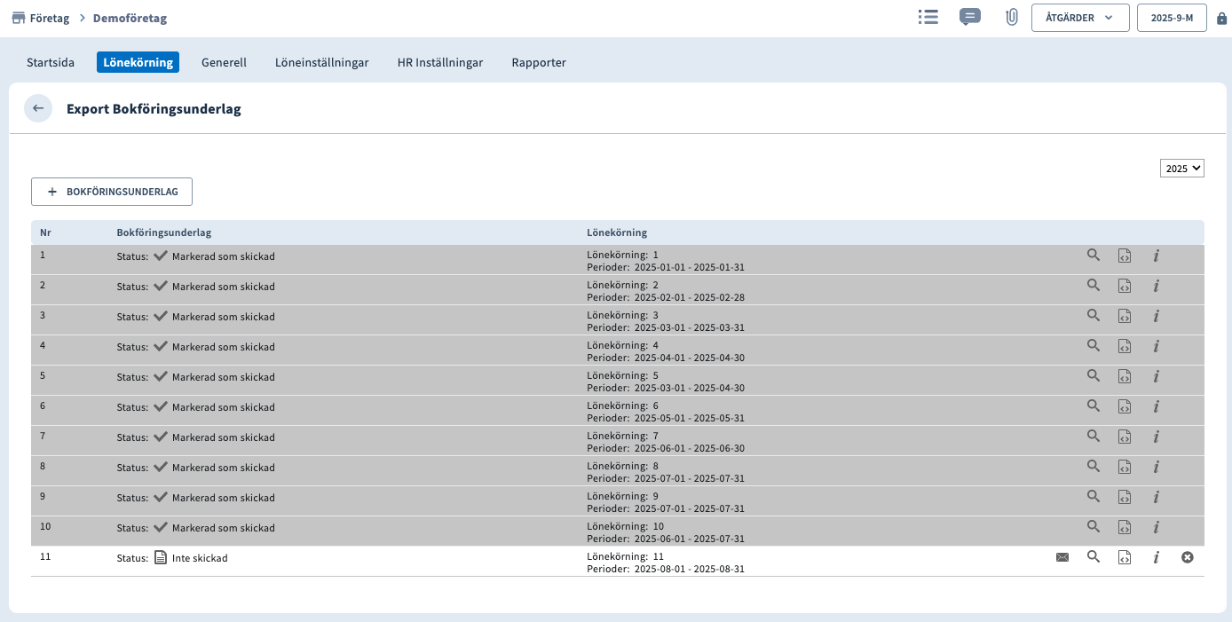 Gå till ditt företag och klicka på fliken LönekörningExport Bokföringsunderlag eller använd sökfunktionen. Här kan du se alla företagets genererade bokföringsunderlag. Om det finns en integration mellan Nmbrs och företagets ekonomisystem kommer ekonomisystemets logotyp synas istället för brevikonen, genom att klicka logotypen kan du skicka underlaget. Med hjälp av ett anpassat Workflow kan man automatisera denna process.
