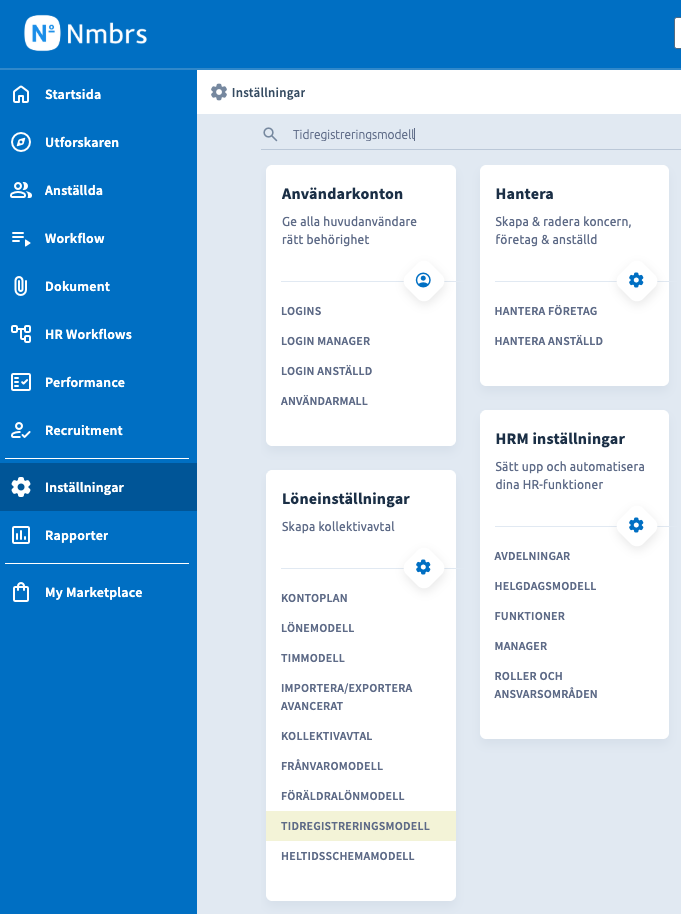 Du finner lönemodellen under fliken Inställningar → Löneinställningar → Tidregistreringsmodell.