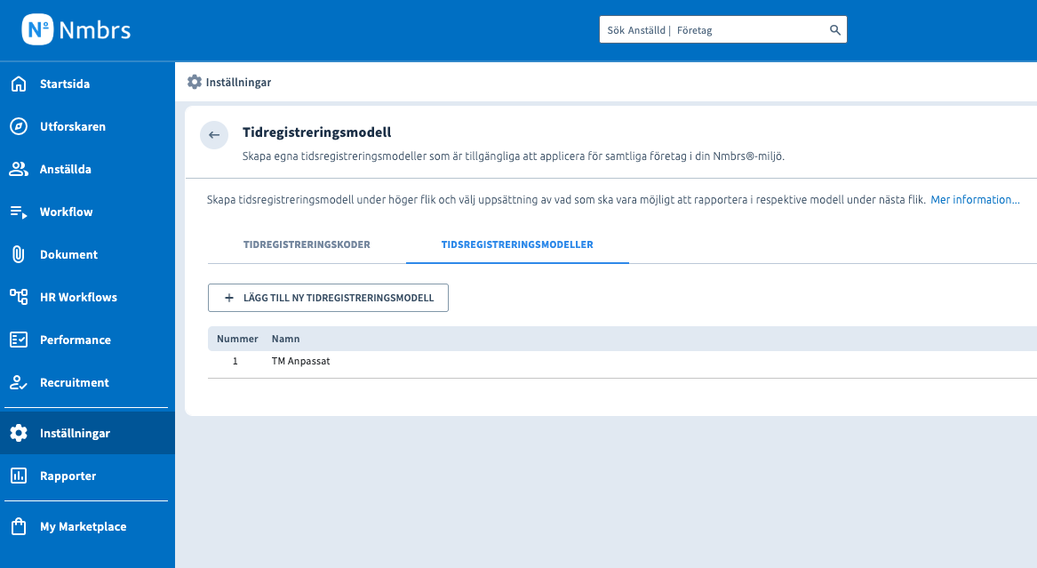 Under fliken Tidregistreringsmodeller kan du skapa nya modeller, se översikten eller radera dem.