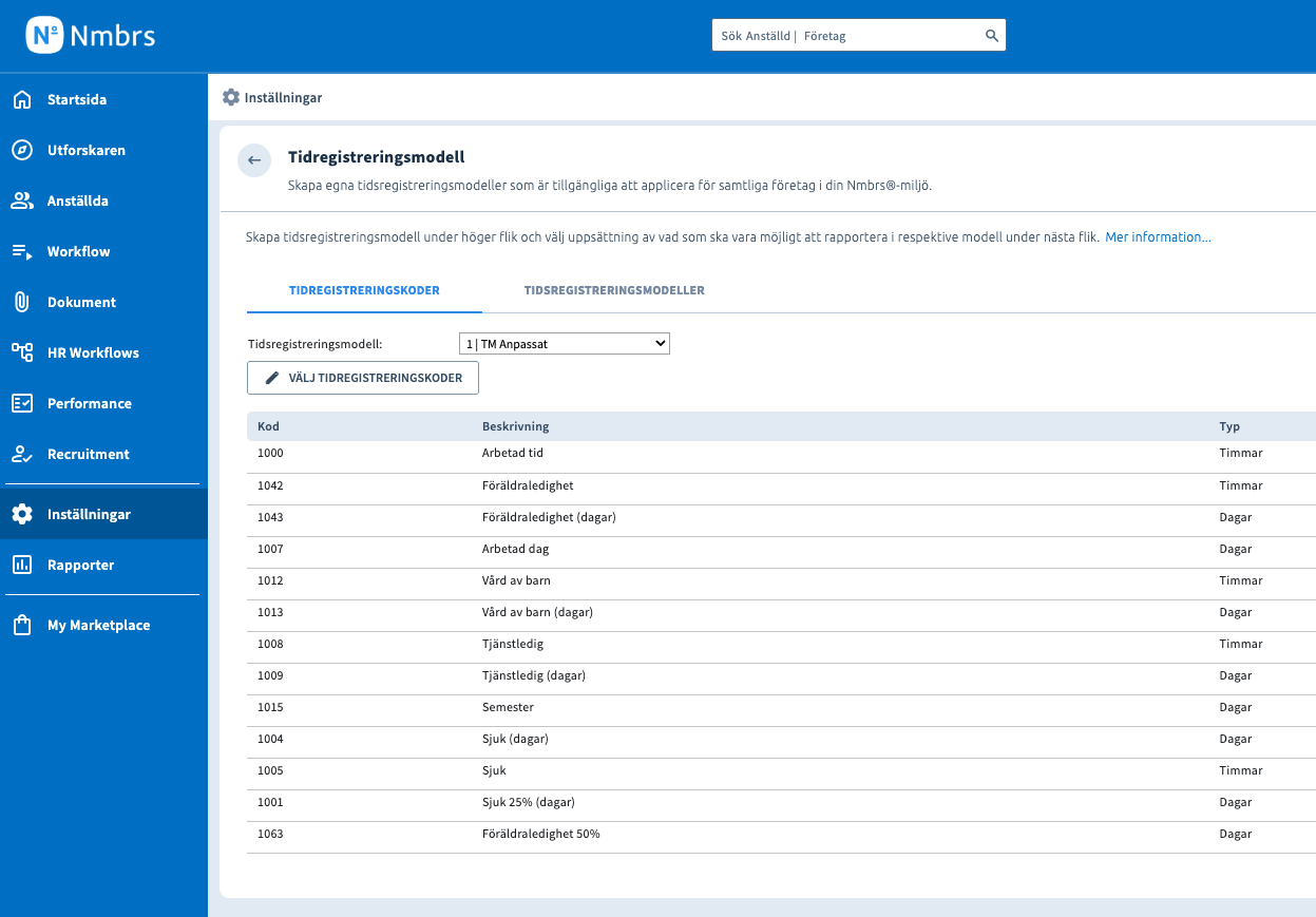 När du går till fliken Tidregistreringskoder kan du sedan välja vilken modell du vill redigera i rullgardinsmenyn innan du klickar på "VÄLJ TIDREGISTRERINGSKODER". I listan på bilden kan man se alla de valda koderna och vilken typ de är. Det är dessa koder som kommer att komma upp som alternativ när man tidregistrerar. Om man tidregistrerar i månadsvy kommer de koder med typ "Dagar" upp och om man tidregistrerar i vecko- eller dagsvy så kommer koderna med typ "Timmar" upp.
