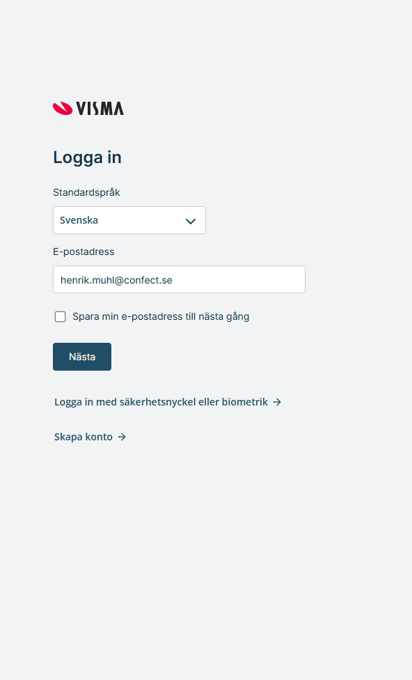 Använd din mailadress som du har kopplat mot de andra system i Visma och som är kopplat till Visma Connect (Visma Home)