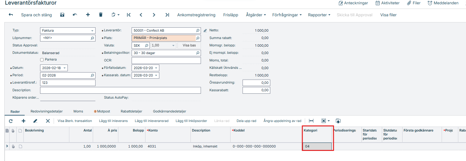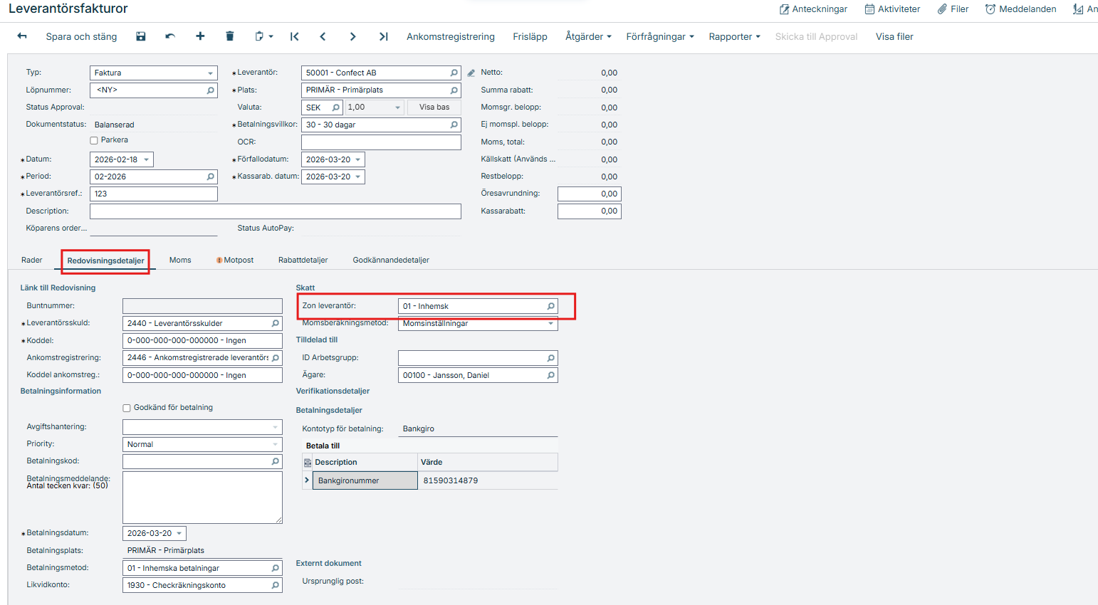 Hade zonen varit 02 vilket är standard för leverantörsklass 20 (EU leverantör) hade vi istället fått omvänd eu moms med samma kategori