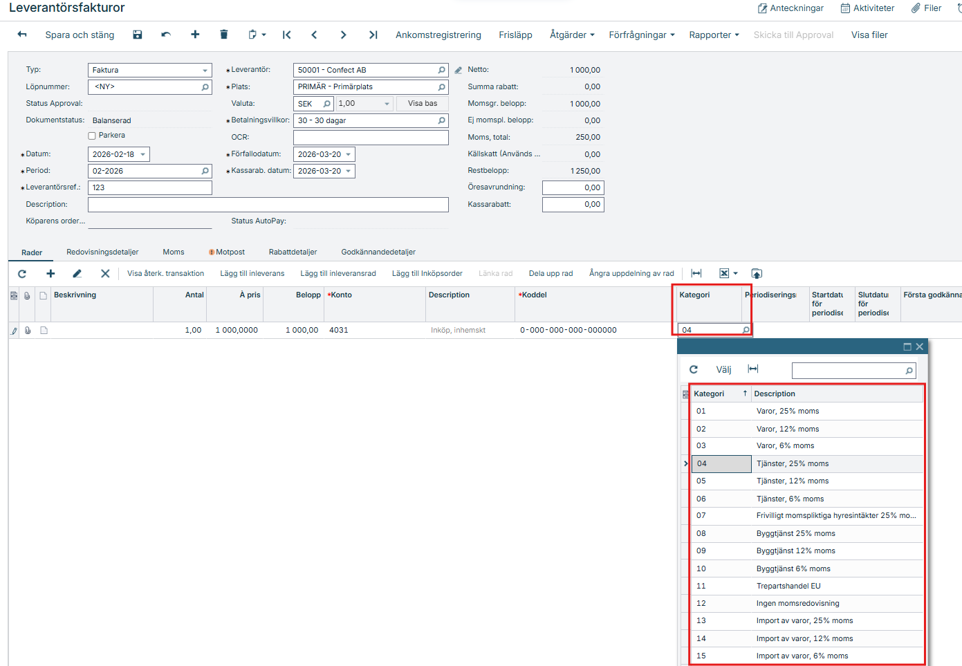 Kombinationen av kategori och zon ger oss en momskod. I och med att det var 25 % moms och zon 01 så får vi inhemsk 25 % ingående moms.