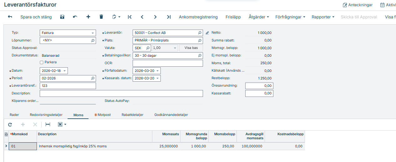 Detta betyder att när du skapar en leverantör och sätter leverantörsklass 10 (Inhemska leverantörer) så kommer denna leverantören automatiskt knytas till Zon 01 Inhemsk. När du sen registrerar en faktura mot denna leverantören så ärvs zonen till fakturan från leverantören och när du sedan sätter en kategori på transaktionsraden så genereras en momskod baserat på vilken kombination av zon och kategori du valt.