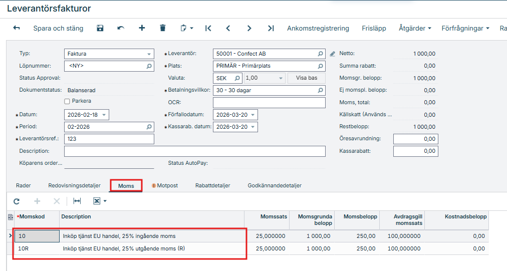 Se exempel nedan för vanlig ingående svensk moms 25 % samt omvänd EU moms för tjänsteinköp: